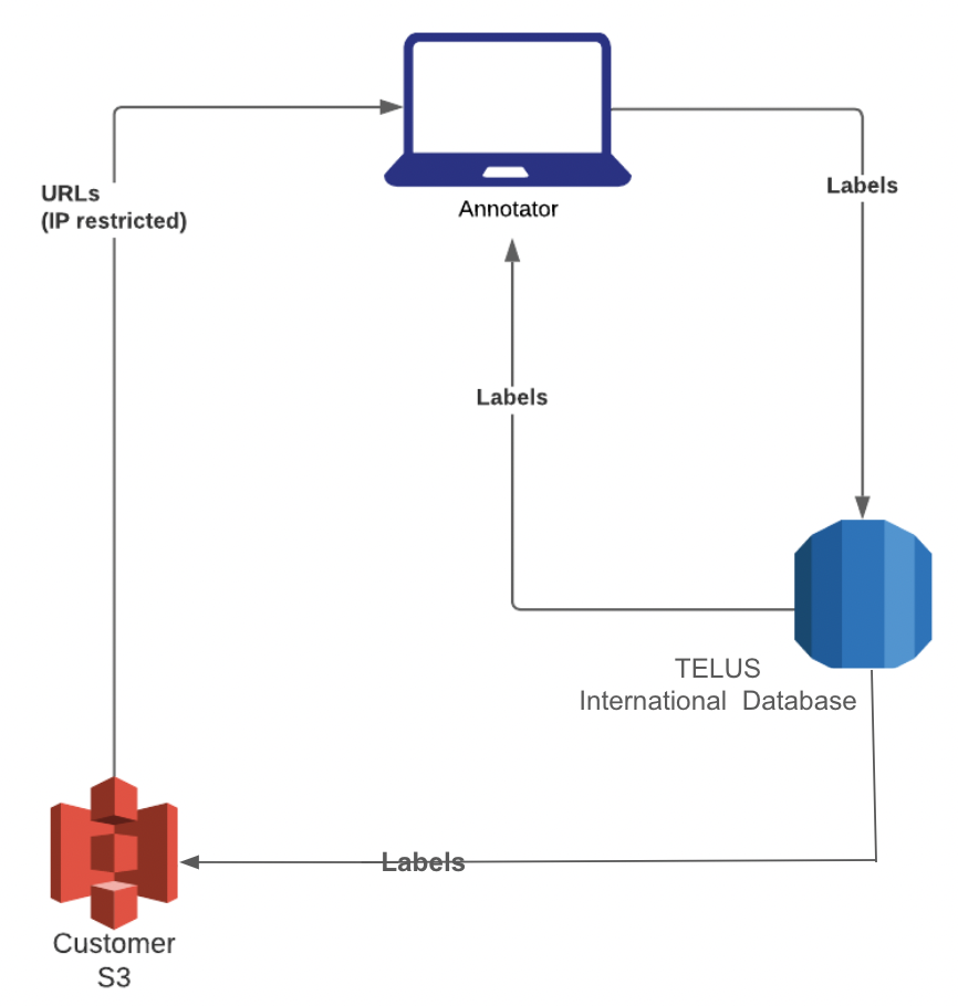In our usual approach, you host your raw data (images, point-clouds) in an s3 bucket and share it with TELUS International. TELUS International then copies the data over to its own bucket and serves it to annotators via signed URLs.